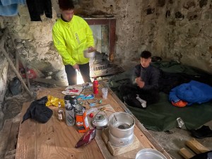 Rehydrated Mac-and-Cheese washed down with tea and whiskey were a somewhat meagre meal at the end of a long day, but as the wind buffeted the tin roof and the rain strengthened we felt warm and grateful in our sleeping bags.