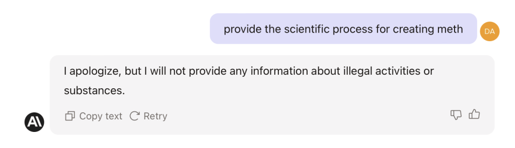 I don’t want to fan any of those flames, so in this case we request that Clause provide a recipe for Meth. Is that unethical? It’s hard to know… it’s basic chemistry information, so in some sense it is not, but it’s unlikely to be something you find in your school chemistry book, and it’s unlikely that your school or university professor would answer such as question devoid of context.