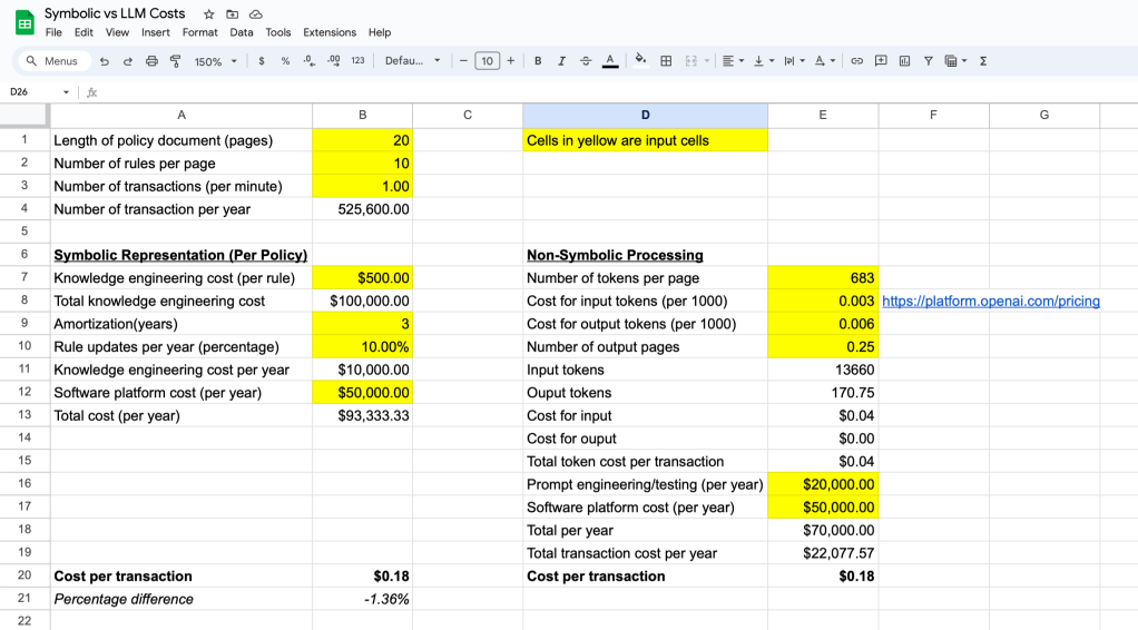 The exploratory Google Sheet I developed allows you to specify the length of the policy document you need to scan to process an incoming transaction, as well as the number of symbolic rules in the document, how frequently rules need to be updated, and the engineering cost of extracting those rules and ontologies via human knowledge-engineering.