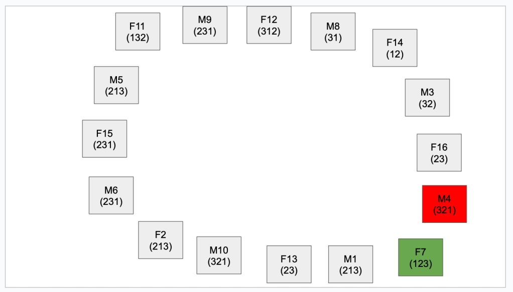 - Recently divorced guests (Guest 4 and Guest 7) not seated next to each other: Guest 4 (m) and Guest 7 (f) are seated several seats apart, with Guest 3 (m), Guest 16 (f), Guest 8 (m), and Guest 12 (f) between them, providing a comfortable distance.