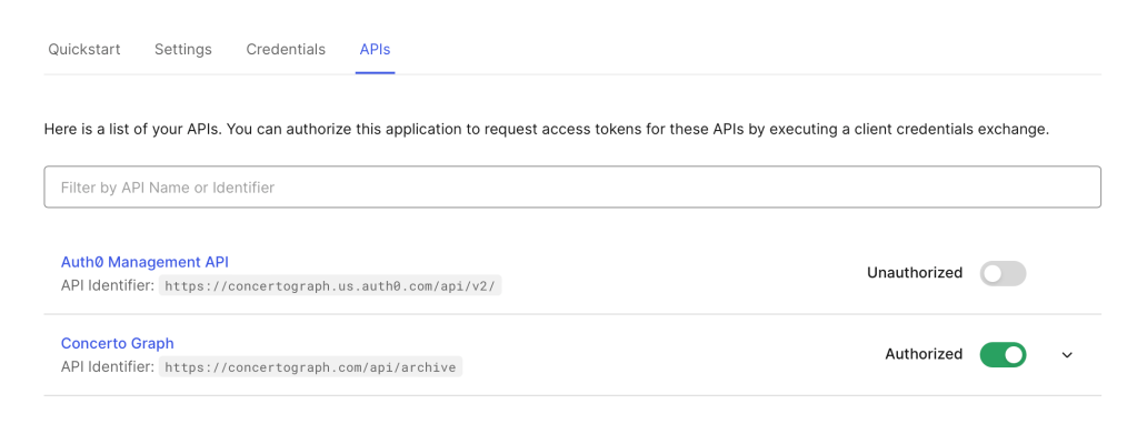 For this article I have created an API with the audience value (identifier) https://concertograph.com/api/archive. Note that this value can be anything you like, it does not have to be a valid web URL.